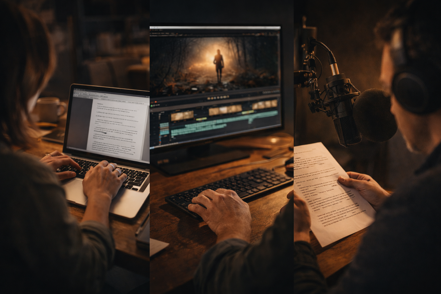Bij Trailercompany geloven we dat jouw boek het vertrekpunt is voor een adembenemende boektrailer. Ontdek hoe we jouw verhaal stap voor stap vertalen naar een visuele en auditieve ervaring die lezers betovert. Een creatief proces, van begin tot eind.